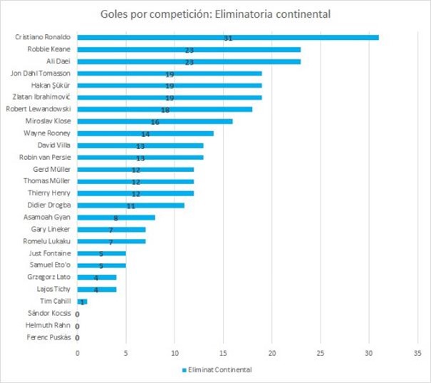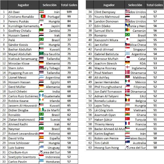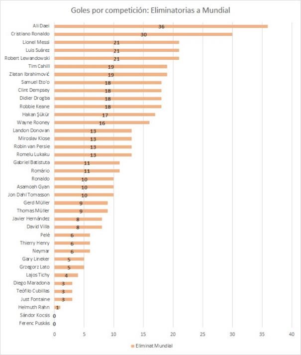 Y vemos algo parecido a la de Eliminatorias a torneos continentales, con Ali Daei (36 goles en Eliminatorias) y Cristiano Ronaldo (30) encabezando el top, pero los que le siguen son una novedad: Lionel Messi y Luis Suárez, que al menos en torneos Conmebol se han fajado a mandarles goles a todos. Llama la atención un toque ver a Ronaldo tan abajo acá (10 goles por Eliminatorias) o a Henry (6) y Maradona (3) – para este último tiene que ver con eso que dijimos de la cantidad de partidos -.