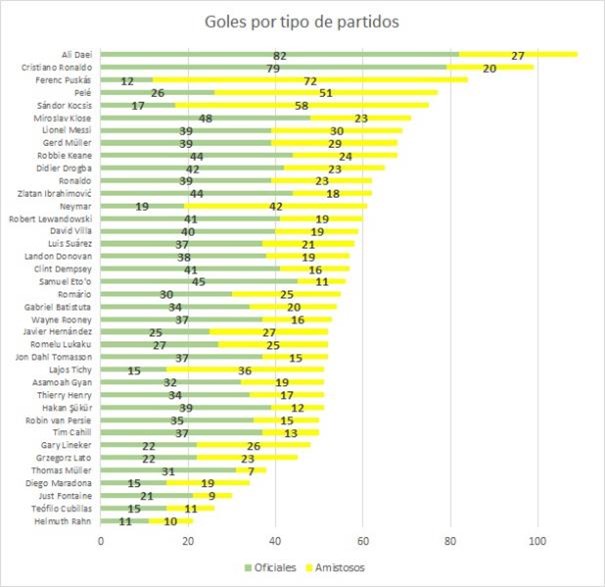 Vamos entonces a limitar la lista a jugadores conocidos (famosos, goleadores, o que uno los ve y dice «ve, este es tal man«), y me perdonan que se me pasó alguno (Cha Bum-Kun, Koller, Pavón). Añadámosle los que no están ahí pero han metido mínimo 10 goles en Mundiales de Fútbol. Ah, y uno que se quedaría afuera pero cómo no lo vas a incluir: un tal Diego Armando Maradona. Veamos entonces el listado de los jugadores (por decirlo así) top, y con un detalle: separando los goles en partidos oficiales y en amistosos, a ver cómo se ve la cosa, en una hermosa grafiquita (ordenada por el total de goles por jugador) elaborada con una app llamada Es él: