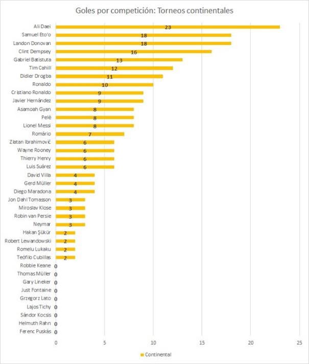 Concentrémonos entonces en desmenuzar la cifra de goles oficiales a ver qué se nota; pillemos primero los goles en torneos continentales (Copa América, Eurocopa, Copa Asiática, Copa Africana, Torneo Amistad del Sur de Oceanía; no cuenta Eliminatorias a Eurocopas, Copas Asiáticas o Africanas):