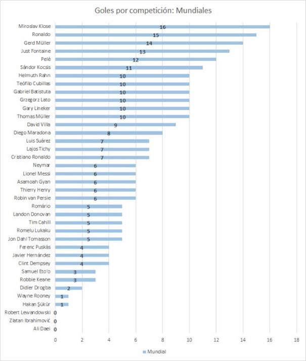 Y más abajo comenzamos a ver las caras de hoy: Cristiano Ronaldo (7 goles en Mundiales), Neymar y Lionel Messi (6), todos debajo de, por ejemplo, Pelé (12), Diego Maradona (8) y los mencionados arriba, más Batistuta (10) y David Villa (9)… no diré nada…. por ahora. Lo que sí destacamos es el hecho que el hípermegaultratetracatregoleador de todas las selecciones del Mundo mundial, Ali Daei, no hizo un mísero golcito con Irán ni siquiera de penal en sus dos participaciones mundialistas… pero no está solo en el fondo: lo acompañan dos ultraconocidos, Zlatan y Lewandowski, dos ilustres 9 que en Mundiales no hicieron una verga. Y no muy lejos está Wayne Rooney, una megaestrella del fútbol inglés que en Mundiales solo hizo un puto gol… hasta que no salieron de ese refisal no comenzaron a retomar el camino los ingleses.