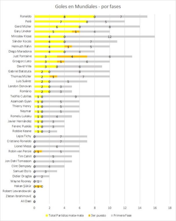 Pero vamos más allá: Klose tiene 16 goles en Mundiales, Ronaldo 15, Pelé 12, Maradona 8, Crishianu 7, Messi 6, y blablablá. Pero, ¿qué tantos fueron en partidos mata-mata (esos que si pierdes, chao) y qué tantos fueron ante Honduras eliminada en el último partido de primera ronda del Grupo C?. Vamos a verlo acá: desgranemos los goles de los jugadores de este listado por a) los anotados en partidos de primera ronda, b) los hechos en partidos mata-mata y c) en el Fajardístico partido por el tercer puesto, que no define nada pero tampoco te deja eliminado… acá va (la gráfica está organizada por orden descendente por los goles en los partidos mata-mata):