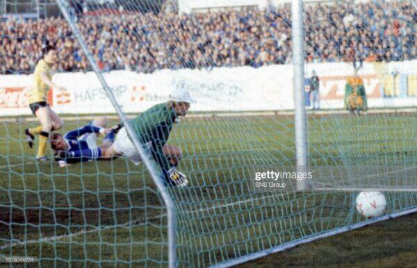 Jim Bett (de amarillo) anotando el 1-0 al minuto 86 en Reykyavik, que salvó de la churreteada a los escoceses. El otro que los mantuvo vivos fue el portero Leighton, que atajó un penal en el primer tiempo.